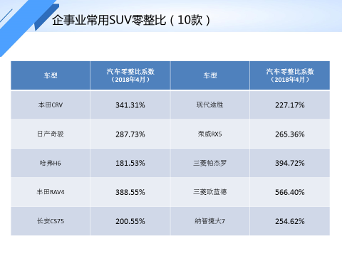企事业常用车型零整比(2018年4月)