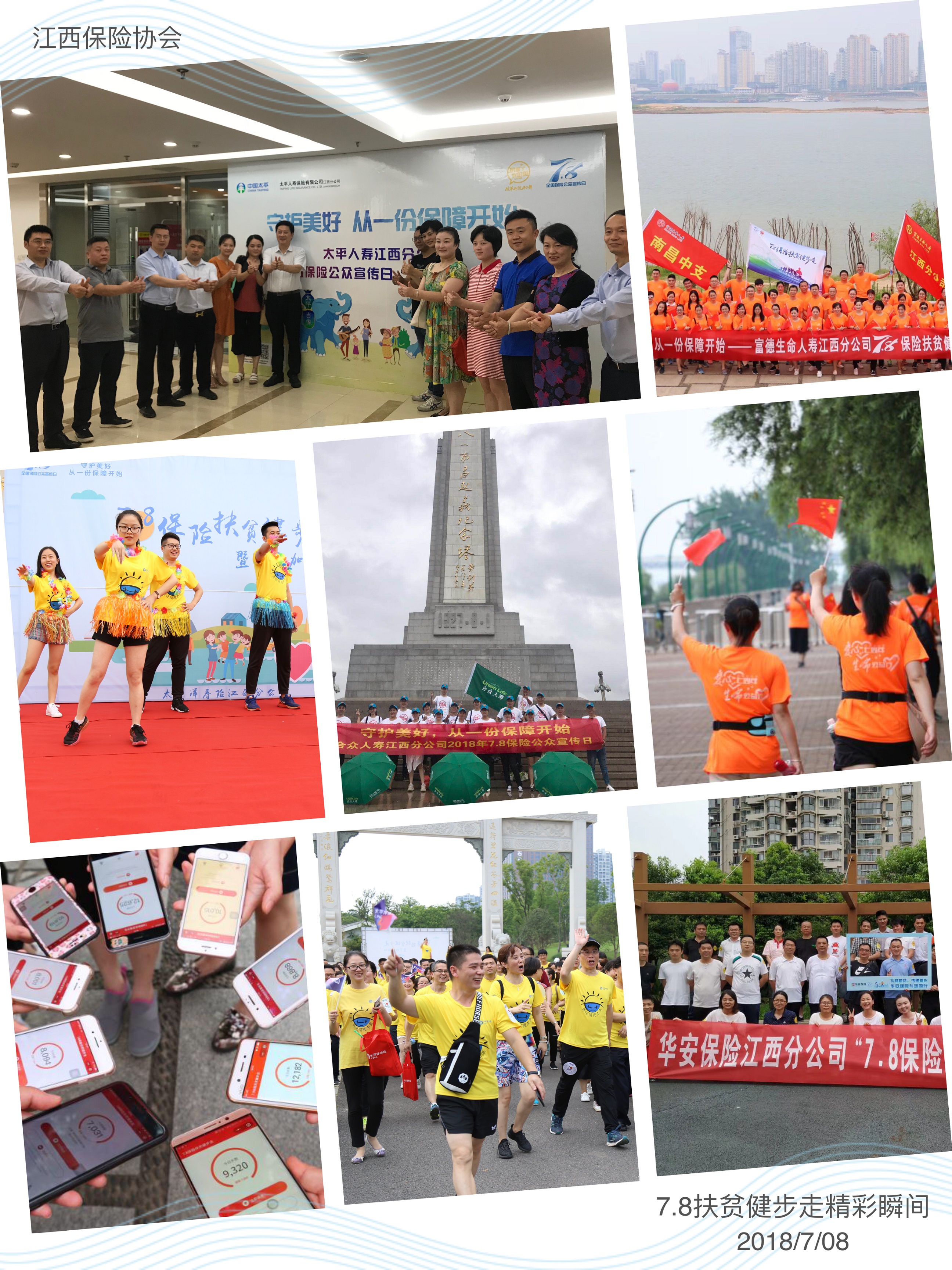 江西保险业省市县同步开展“7.8保险扶贫健步走”活动,艳阳高照下,倾盆大雨下都有江西保险人的身影。公司充分动员内外勤员工、保险客户一起参与健步走活动,让社会公众感受江西保险业同心共行,为贫困地区奉献爱心的决心。活动期间,江西保险业累计捐赠超过2.14亿步。同时,各公司创新拍摄“我给7.8点个赞”手指舞视频,协会也邀请省主流媒体参与“发现保障背后的故事”开放日活动,把保险的责任和担当,科技和创新向社会传播。